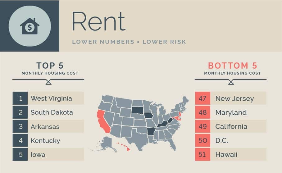 Total monthly housing costs for renter-occupied homes. West Virginia’s monthly cost of $681 was the lowest in the nation, while Hawaii’s $1,507 was the highest. The national median was $982.