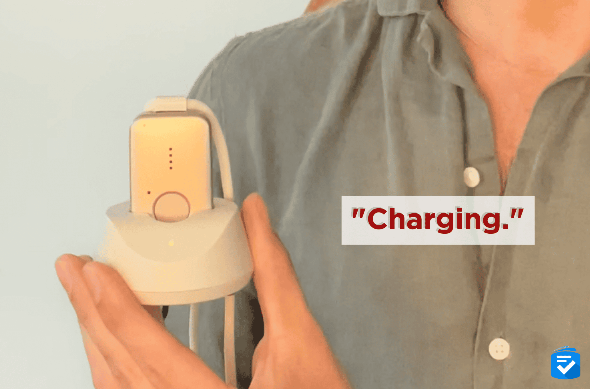 To get started, I plugged one end of my USB wire into the charging brick and the other into the charging cradle, then plugged it into my wall. The charging cradle displayed a green light, and I put the MGMini on my charger with the help button facing toward me. The device said it was powering on and then charging. Once the LED light turned from red to green — about four hours later — it was fully charged and said, “Device ready.”