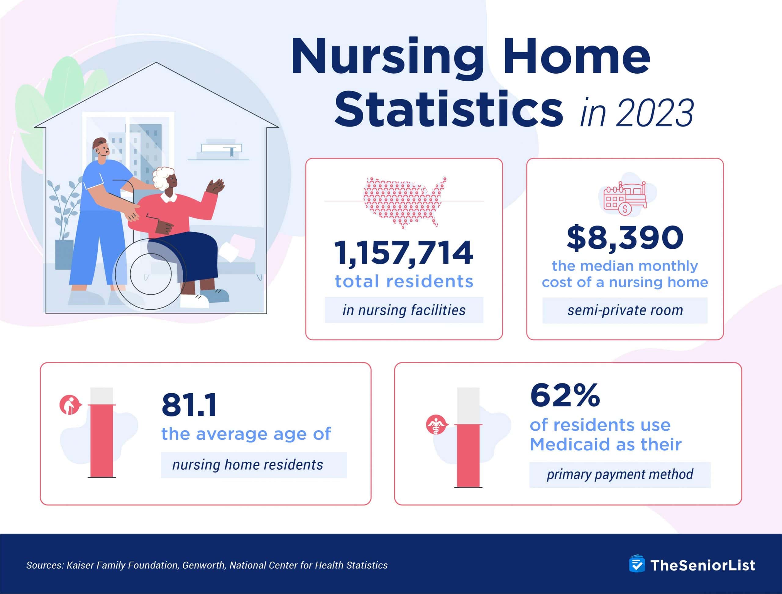 - In 2023, nursing homes cost an average of $8,390 per month for a semiprivate room and $9,584 per month for a private room.